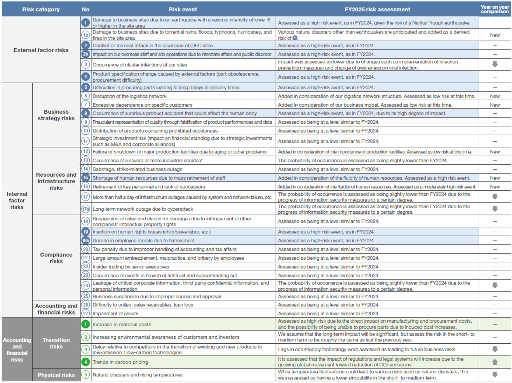 可能对IDEC集团的可持续业务扩张和企业价值增加产生负面影响的事件被认为是 "风险事件",风险监测小组委员会定期识别和评估风险。对于每个风险事件,以 "发生概率"、"损害程度 "和 "影响 "为指标进行问卷调查,并将结果绘制在风险地图上,进行相对评估。