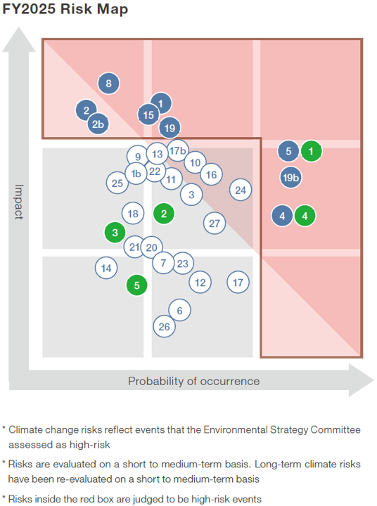 被环境战略委员会评估为重大的气候变化风险也被纳入并评估为 "风险事件"。被评估为具有高发生概率或高影响的事件被指定为 "高风险事件",并为其管辖的每个部门制定年度风险降低目标,每六个月在上半年和下半年检查一次进展。